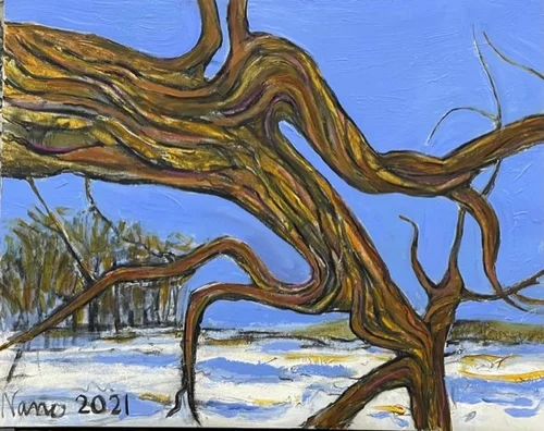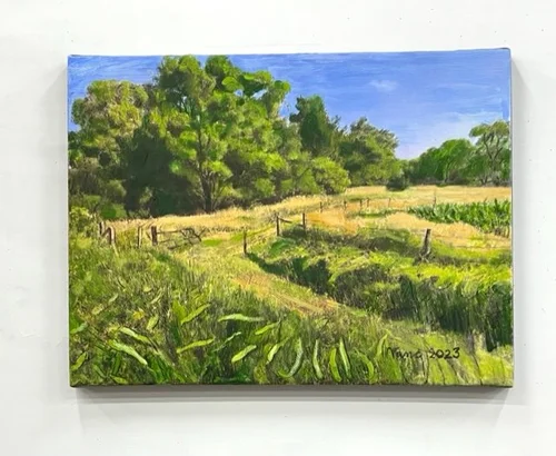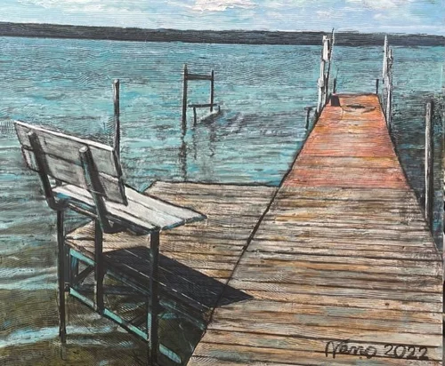 A gathering of friends in Minnesota was the perfect setting to capture natural lakes, meadows and rivers. I have described nature in heavily layered textures and serrations using a comb fragment which is skimmed with charcoal. All paintings are 16”x20” acrylic.